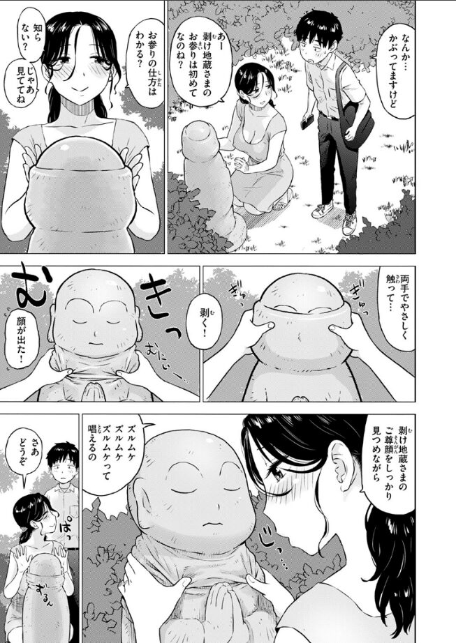 「《剥け》地蔵さまね ズル剥け祈願の」ネットで密かに噂の剥け地蔵さまにお願いしに来た僕。夫の勃起祈願のお礼をしていた人妻に案内してもらい、いろんなお地蔵さまへ参ることに。お願い事を間に人を通して聞いてくれる《又聞き》地藏さまの前で、人妻とSEXすることになって!?