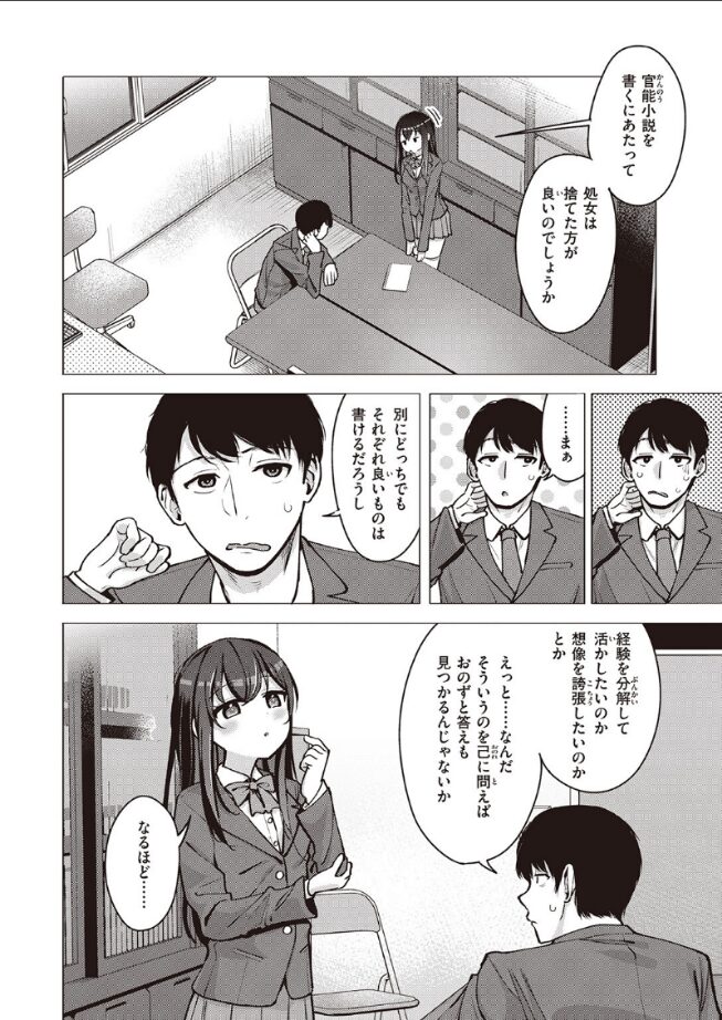 「官能小説を書くにあたって、処女は捨てた方が良いのでしょうか」文芸部の先輩に意識してもらいたくて、誘ってみた黒髪美少女の後輩。冗談にしようとしたけど、先輩が本気にしてくれて……!!想定していたはずなのに、思ってたよりも恥ずかしくて、思っていたよりもずっと気持ち良い♪恋する文学オトメのモノローグで感じるドキドキ初体験!!
