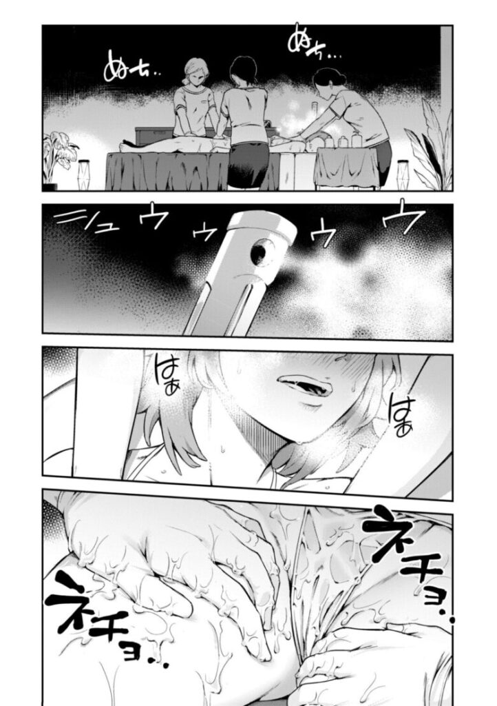 きわどい水着に着替えさせられ、なぜかアイマスクとヘッドホンを着用して施術を受けることに。