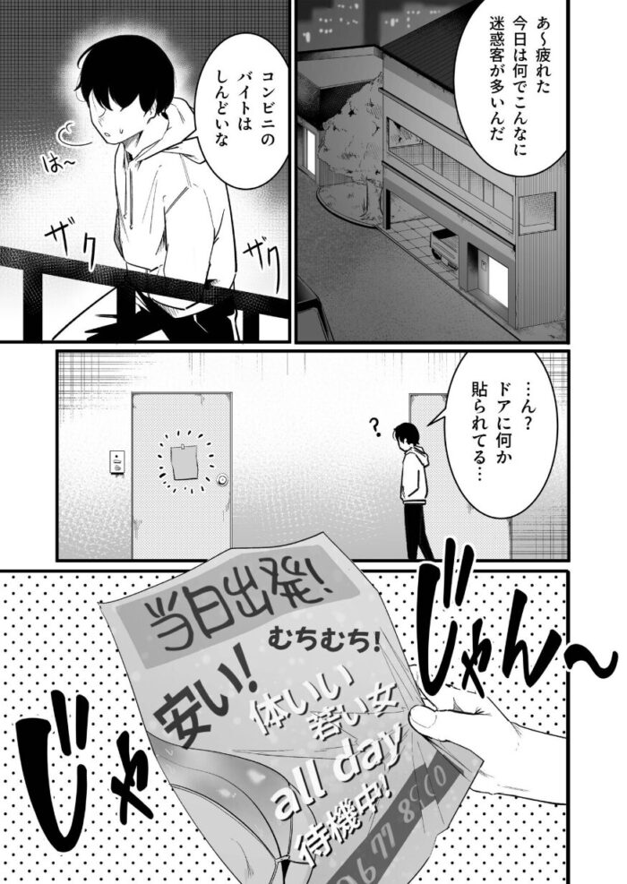 バイトから帰宅しアパートの扉に貼られた風俗?のチラシを見ていると、お隣の引きこもり黒フードの陰キャ女に話しかけられる。その女に勧められチラシの連絡先に電話をすることになったがなにやら怪しい雰囲気。電話を切ろうとすると…「フ〇ラチオ!生〇メ!ア〇ル!緊〇!キス!乳首!」「何でもしますから一度だけでも利用してくださいぃぃ!!」それでも切ろうとすると…「乳牛コスプレ!」……俺はOKしてしまった。