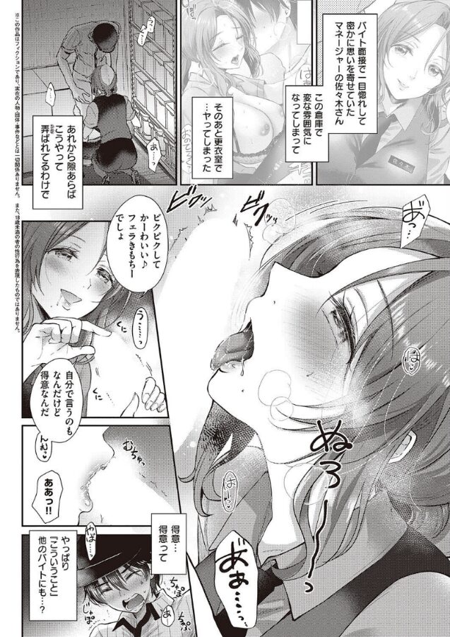 主人公・小野寺は、バイト先の巨乳美人マネージャー・佐々木さんと更衣室でSEXした日から身体の関係ができてしまう。佐々木のことが好きな小野寺は、年下だから遊ばれてるのでは…と、今の関係に悩み中。そんな時、大雨で帰れなくなった小野寺を佐々木が泊めてくれることになる。「じゃあここからお楽しみの時間ってコトで」と当然のように佐々木に誘われる小野寺だったが――!カワ淫お姉さんの申し子・源先生が贈る、妖艶上司とエッチ秘密の関係、後編!