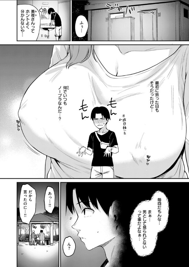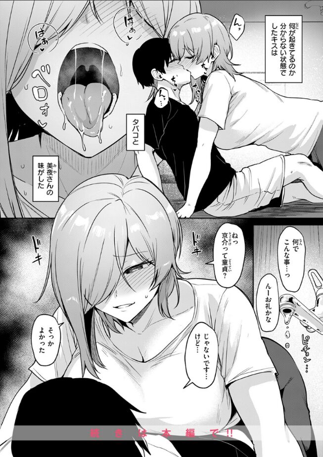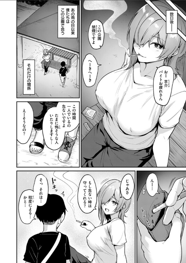 「おっぱい触ってみたい? いつも見てたでしょ」彼女は美夜(みや)さん。近所の公園で出会った、不思議なひと。毎日のように公園で逢っているのに、僕が彼女について知っているのは、6歳年上で、煙草が好きで、なぜかいつもノーブラ……というくらいだけ。その無防備な姿を実はオカズにしちゃっているけど、きっと彼女は僕のことを男として見ていない。このまま何も起きない逢瀬がずっと続くと思っていたら、ある晩、ガラの悪いナンパから助けるために、思わず美夜さんを自分のアパートにまで連れてきてしまって――不意打ちのディープキスは、美夜さんと煙草の味がした。