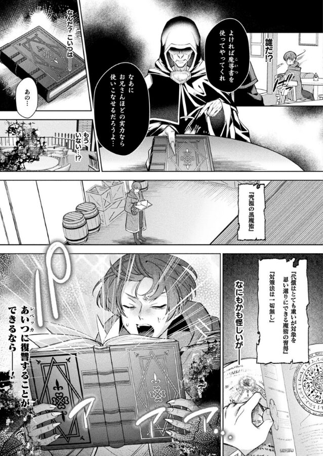ゴブリン化したパシリ魔導士に逆襲される女戦士! さらには過去のトラウマも掘り返されモンスター輪●! 魔導士のアランはペアを組んでいる女戦士、レベッカによる不当な扱いや理不尽な暴力により鬱屈した感情を募らせていた。ある日、とうとうレベッカへの怒りが限界に達した彼は謎の人物より黒魔術の本を託され、復讐のための力を手に入れる。後日、待ち合わせの時間になっても来ないことに苛立つレベッカの前に1匹のゴブリンが現れる。その正体は黒魔術を習得する代償でゴブリンへと姿を変えたアランであり、都合よく彼を亡き者にてペアを解消しようとするレベッカは彼の魔法により身体の主導権を奪われてしまう。身体を発情させられパイズリフェラ、イラマ窒息喉奥射精でその肉体に熱を帯びつつも抵抗するレベッカに対し、アランはゴブリンチンポを濡れそぼった彼女のマンコへねじ込むのであった――。