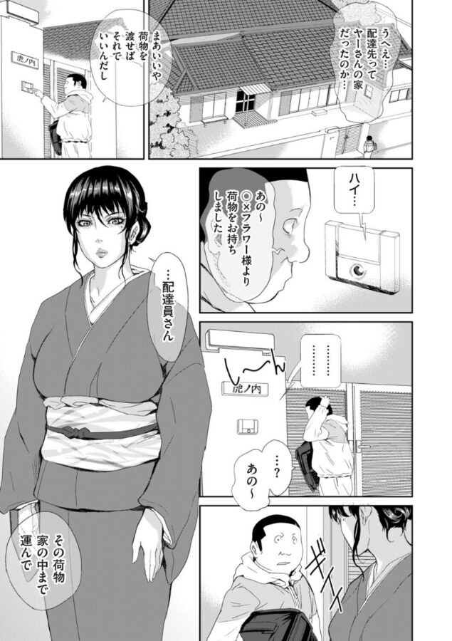 配達員の仕事をしながら自分の私怨を晴らすため、女性たちを何度も襲っている丸男。今度の配達先はヤクザ者の家で、組の幹部だった夫をなくし、喪に服している未亡人に花を届ける仕事だ。だが、丸男が仏壇に花を供えたその時、その美麗熟女は突然服を脱ぎ、縄で縛られた裸体をあらわにした。そして、変態SMプレイを強要してきたのだが……。