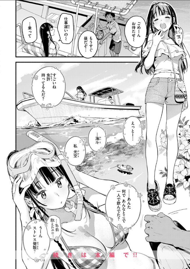「島の人ってさ、初体験はビーチで…だったりする?」――観光地としてはそこそこ有名だけど、綺麗な海と小規模な繁華街以外、何もない小さな島。夜釣りに来ていた島の青年・海斗(かいと)は、夜間立ち入り禁止の堤防でフラついている酔っ払い女子を発見。案の定、転落…しそうなところを助けたつもりが、一緒に海でダイヴ!夏の夜のエモい海。ずぶ濡れの出逢い。酔っぱらっていた女のコ・光空(ひかり)はリゾートバイト(キャバ)でこの島にきたらしい。初対面から《お礼》としてキスしちゃうような貞操観念ゆるめ女子だ。ドキっとするようなセリフを軽々しく口にする様子に、少々おカタい性格の海斗は警戒心マックス。どうせ営業だろ?と思いつつも、オフの日に島を案内する提案をしてみると…?なんだかソワソワする季節、海と山と空、そしてエッチなアバンチュールが開幕!?
