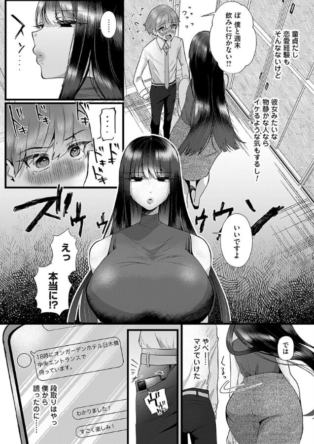 あなたの性癖、全部わかってますから…。地味系デカ女で愛重め。見下ろし僕だけに見せてくれる彼女の仕草に腰砕け!?同期の大沼(おおぬま)すずさんは、影で『八尺様』と呼ばれている。高身長で物静かなためか、周りから距離を置かれているが僕はそんな奥ゆかしい彼女が好きだ。なんとか取り付けたデート当日。大沼さんは深い谷間とぶっとい太ももがスリットであらわになった服でやってきた!会社での肌の露出を抑えた格好とのギャップがすごすぎるよ…それに胸はMカップもあるなんて…個室で僕が生乳を見たそうにしてたからか、突然大沼さんは服を脱いできた!初めて見て触るおっぱい&陥没乳首。重すぎる胸を掻き分け勃起乳首を露出させむしゃぶりつく。「やっぱり胸が好きなのですね」どうやら僕が普段会社のPCでエッチなサイトを徘徊してるのを目撃して、大沼さんは僕の好みに色々合わせてくれたらしい。汗で湿った肉厚の脇まで舐めさせてくれるなんて健気でエロ可愛すぎる!だけど服の上から太ももで股間を刺激されてすぐ射精しちゃう僕、早漏すぎて情けなさすぎる…そしてペアルックの恥ずかしい服に着替えさせられて、大沼さんの身体で僕は押し潰される。「たくさん射精できて偉いですね」密着素股マンコで無様にまた射精、アナルディープキス手コキで追い討ち射精。好みや弱点を知り尽くされた僕は、大沼さんを満足させることができるのだろうか…
