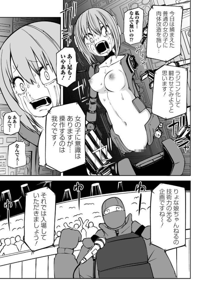 社会的に完全に逸脱している動画配信を行っている三人組に誘拐され、勝手に戦闘ロボットのボディに改造されてしまった二人の少女。再生回数を稼ぐタネとして、意識はそのままにラジオコントロール操作によって無理矢理戦わせられる少女たちの運命や如何に……!? これまで執筆した商業作品群をまとめた待望の初単行本【デッドエンド・ガールズ】は紙版および電子版ともに好評発売中です!!※ この作品はアンソロジーコミック「リョナキング vol.17」に 収録されている作品の単話配信です。