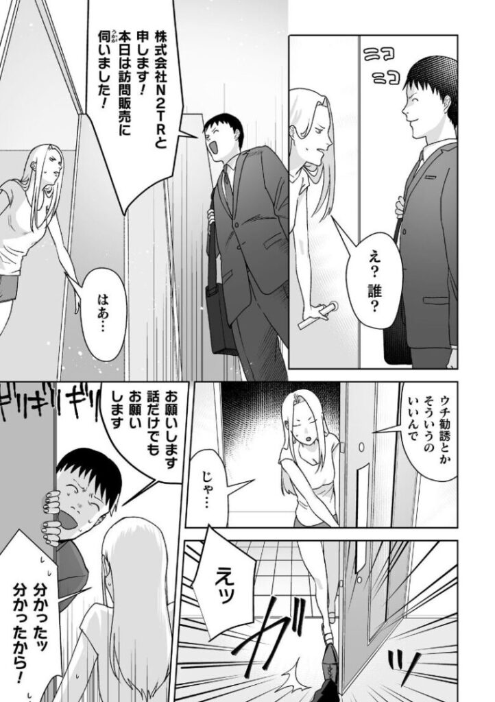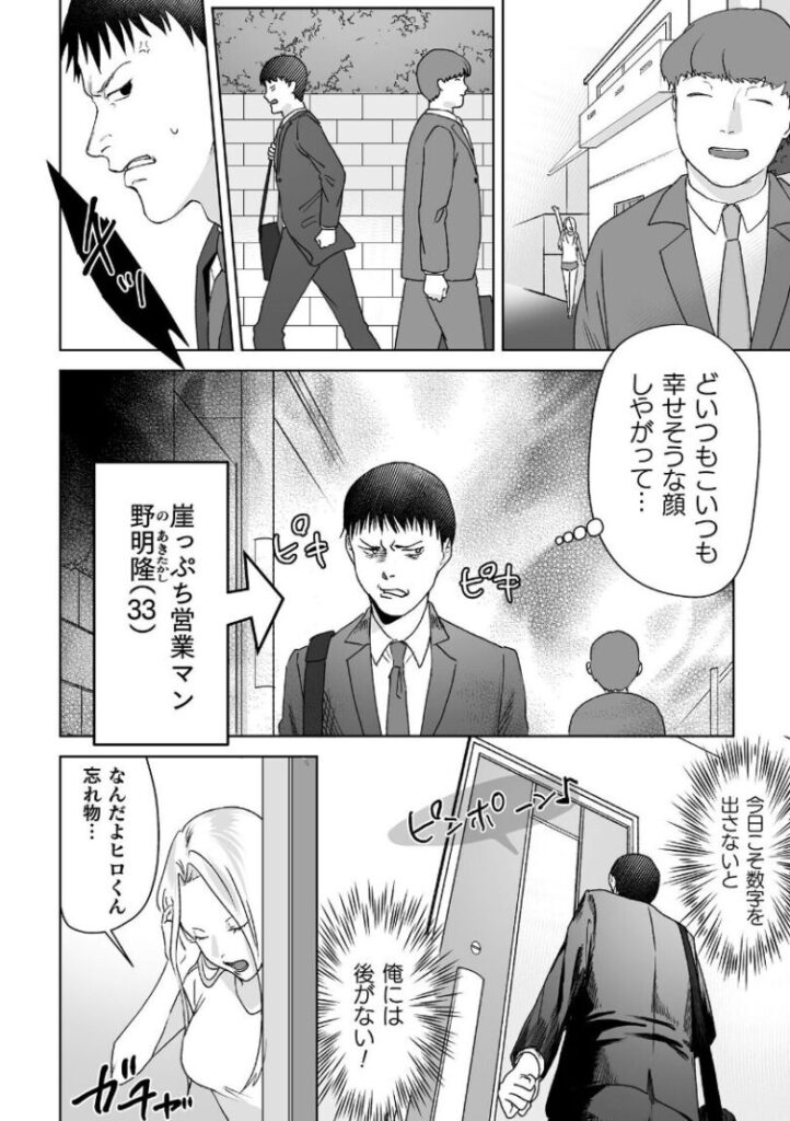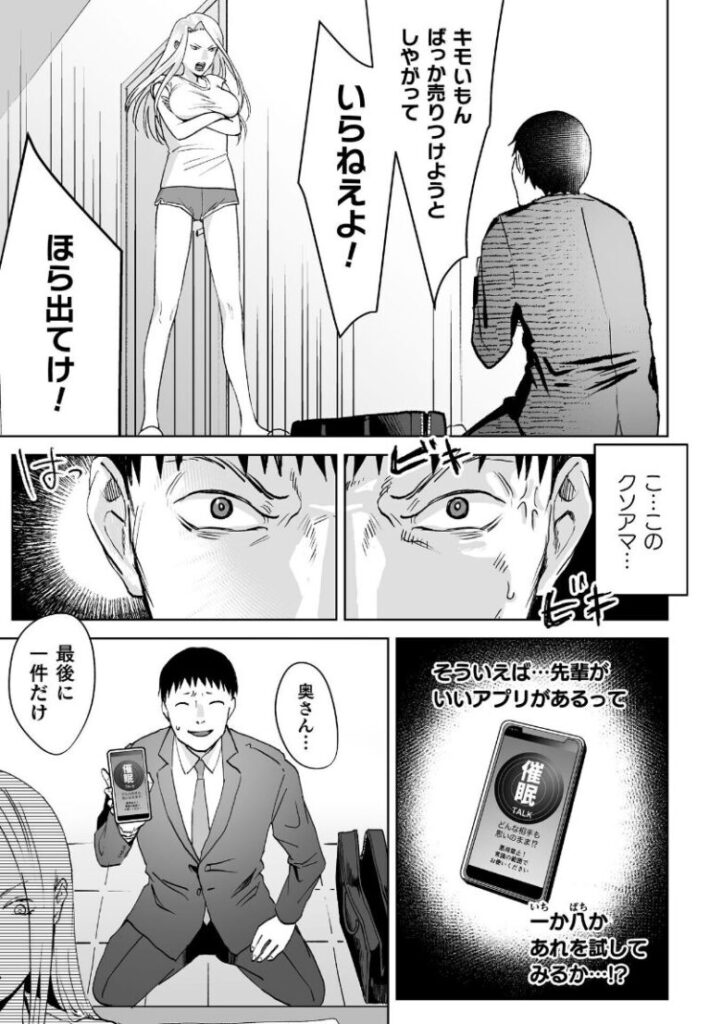 うだつの上がらないエロいグッズ訪問販売営業の男は今日も売れない商品を売るために家庭訪問をしていた。ある日、訪ねた先には生意気そうなヤンキー人妻に強引に営業をかける。商品について詰られ怒り心頭の男は先輩に聞いた催●アプリで人妻に自分が旦那だと思い込ませる。夫だと思った人妻は昼間から今までの塩対応から甘くエッチなおねだりを始めてしまう。途中催●解除された人妻は夫とは違うチンポの味をおぼえこまされて’契約’してしまうのだった。※『二次元コミックマガジン 催●NTR Vol.2』に掲載されている作品です。