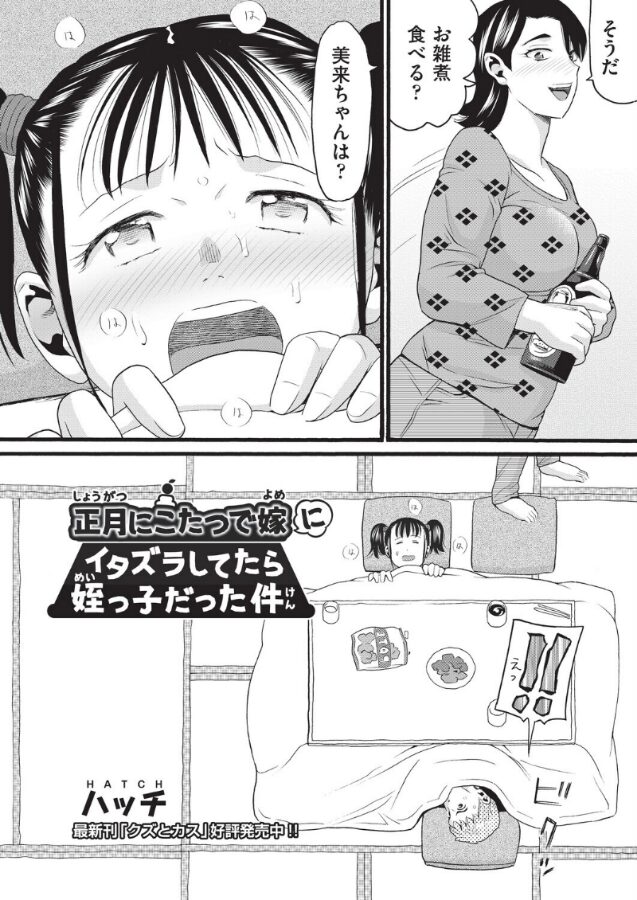 寝正月を満喫していた男は、いつの間にかうたた寝していたらしい。親戚一同が初詣に出かけたことを同じコタツに入っていた妻が教えてくれた。だらっとした空気の中、ふとイタズラ心が芽生える。コタツの中へ手を伸ばし、すべすべした太ももに触れる。反応がないので調子にのって布地のあたりまで指先を進める。しっとりしてきた中央の感触に「そういえばご無沙汰だったなぁ」と手を滑り込ませる。その時──「お雑煮食べる?」妻がふいに立ち上がり台所へ向かってしまう。コタツには‘下半身’だけが残された。……あれ?これは誰の下半身?「美来ちゃんは?」妻の声かけに「……いらない」上擦った声が聞こえる。やってしまった──。こちら側から死角になっていた場所に、姪っ子が寝転がっていたのだ……。