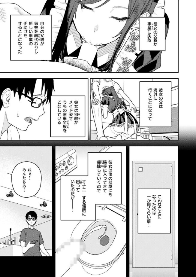 陽キャ・ギャル・クラスの一軍。平凡地味な僕とは住む世界がちがうはずの華(はな)ちゃんだけど、実は僕たち幼なじみ。そして華ちゃんは――なぜか、メイド姿で僕の家に住み込み、性処理まで幅広く家事全般をこなしている。口で抜いてもらうのも…日課だ。お金絡みの事情で、彼女の家を僕の父が助けた…というのはあるけれど。でもだからといってこんなことまでするのは絶対におかしい。なぜなんだ…!?