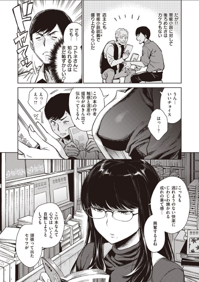 「私から艶っぽい言葉が出てびっくりした? 私も官能小説好き」行きつけの本屋さんにいるのは、いつもの店長ではなく……店長の孫のコトネさん。オトナの魅力を放つメガネ美人さんで、昔から憧れている近所の憧れのお姉さんだ。そんなコトネさんが、実はとってもドスケベだったとしたら……!?取り置きしていた官能小説が暴くコトネさんの意外すぎる顔。普段の姿からは想像できない淫語の洪水に興奮も止まらない!! 水音たっぷりのベチャベチャSEXをお楽しみください!!