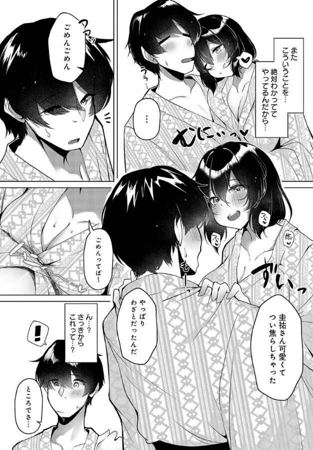 主人公・圭祐は、妻・優香と夫婦水入らずの温泉旅行にやって来た。貸切風呂でたっぷりキスをしてエッチな雰囲気になる2人だったが「続きはお布団でしようね?」と優香に止められてしまう。最近の優香はこうやってわざと煽っては焦らしてくるのだ。そして悶々としながらも温泉から上がり部屋に戻ったところで、優香が下着を一切付けずに風呂から戻っていたことが判明!? 度を越したイタズラに、さすがの圭祐も我慢の限界!? 激しい手マンや露天風呂での立ちバックで、優香がイッてもイッても止めないお仕置きSEXがはじまる!!積極女子マイスター・けーしむ先生が贈る、淫乱な妻がイッても止めない反省SEX!!